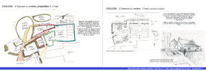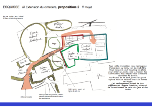 Esquisse pour la mairie de Saint Connan, commune rurale près de Saint Brieuc. La demande était d’imaginer un aménagement pour agrandir le cimetière actuel tout en incluant de la vie car une maison communautaire est installée non loin. C’est un projet très intéressant puisqu’il fait se rencontrer à la fois un lieu de vie, de jeux, d’activité et un espace de recueillement et de prière.