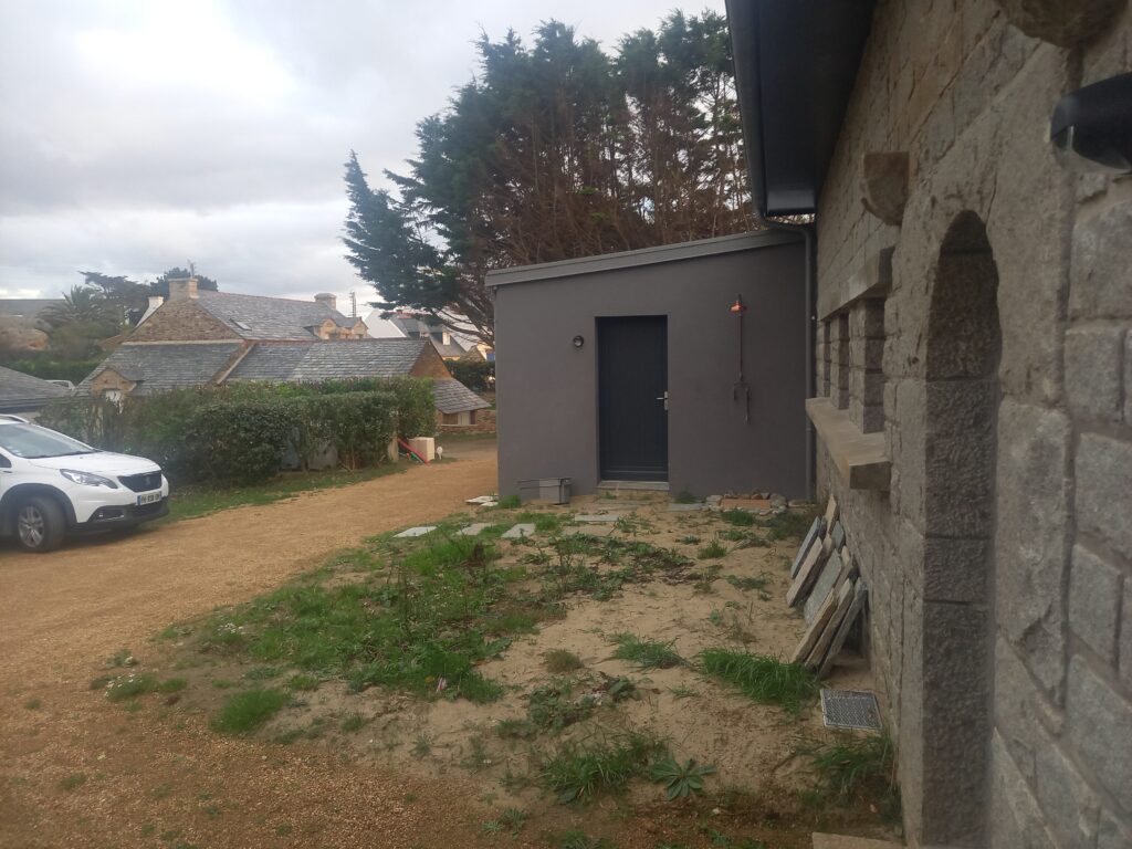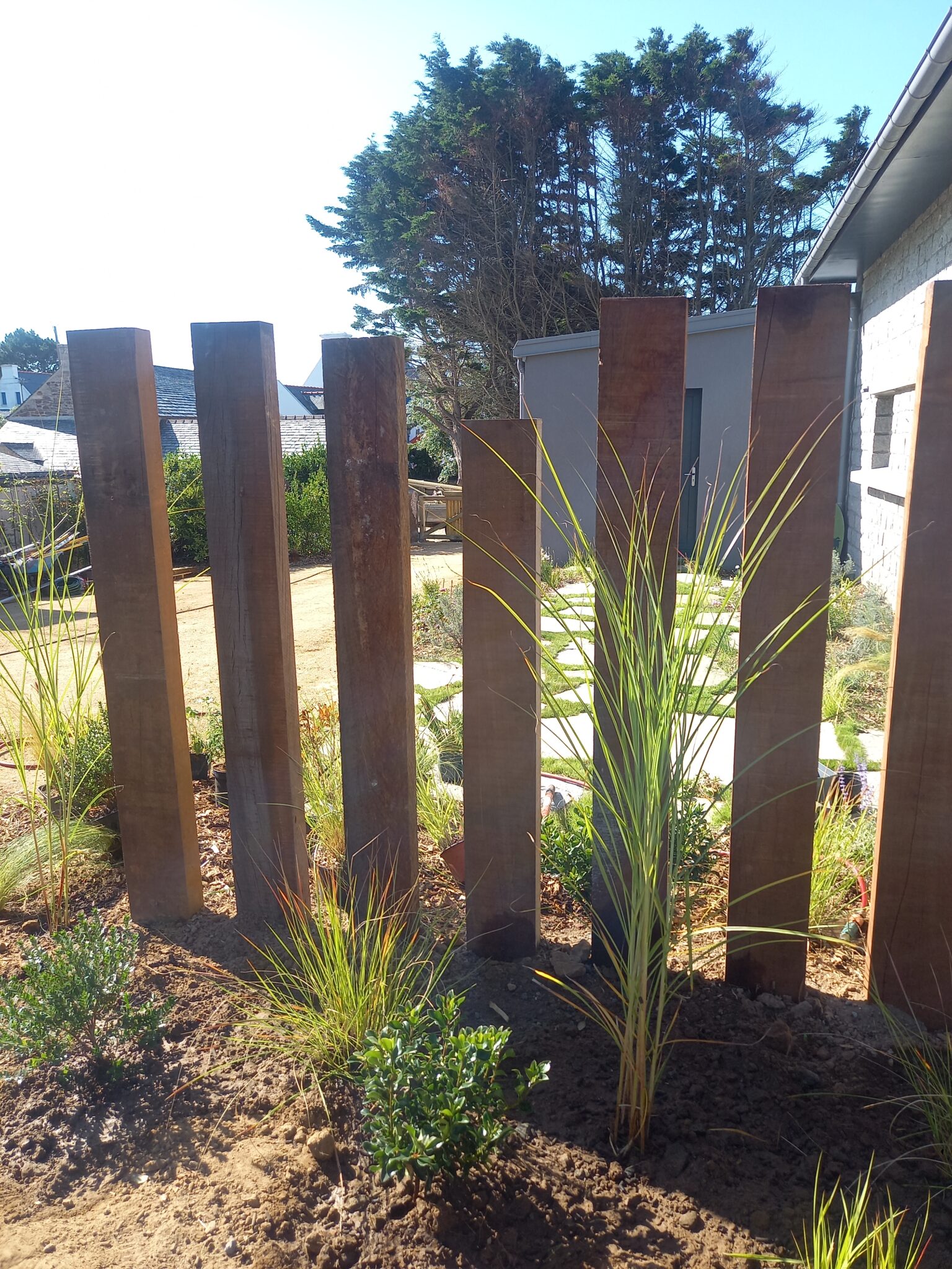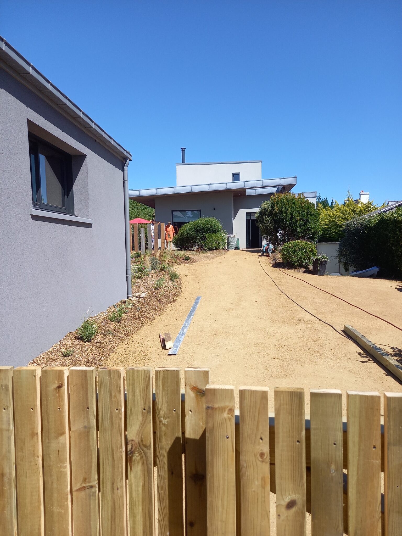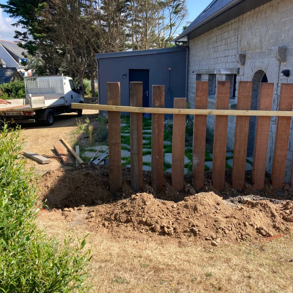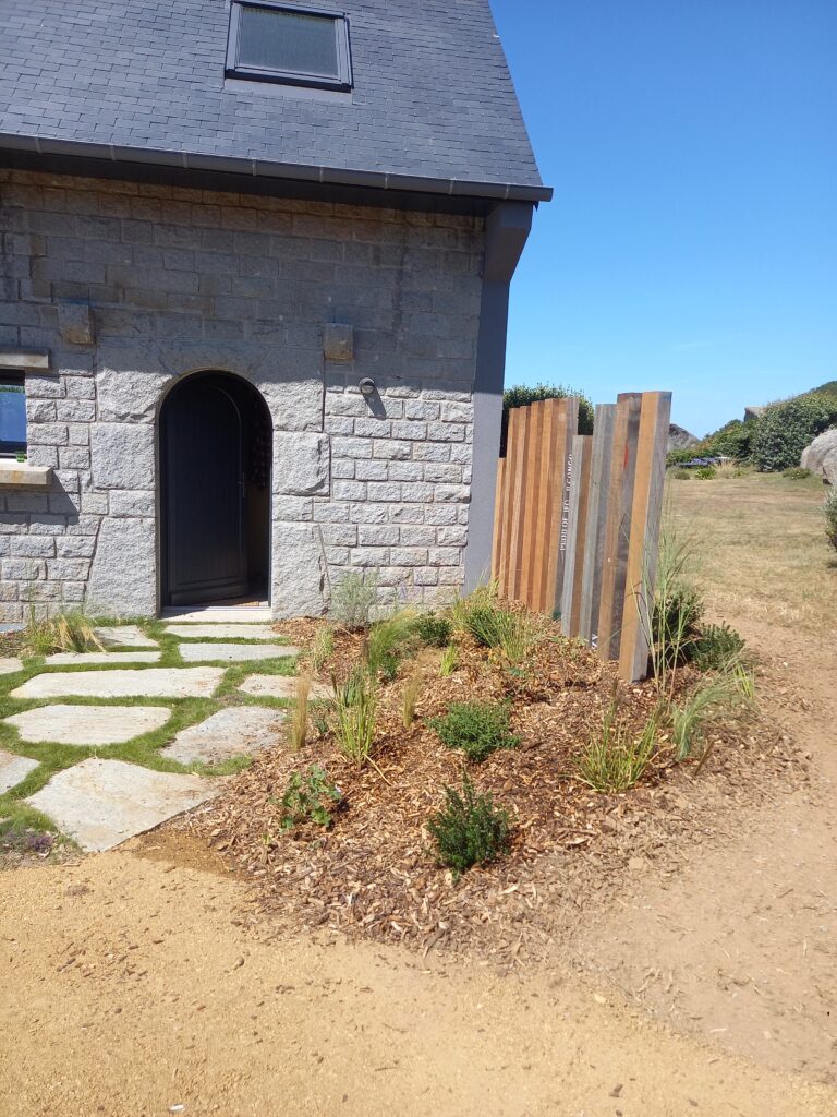- Conception de divers éléments (local poubelle, portail double ventaux, parking en stabilisé, brise-vue en traverses de bois … )