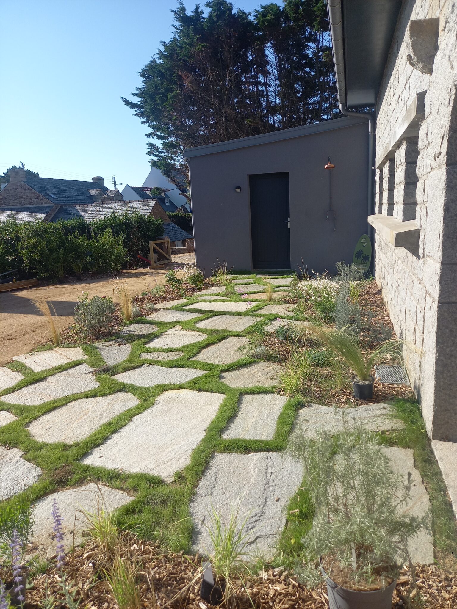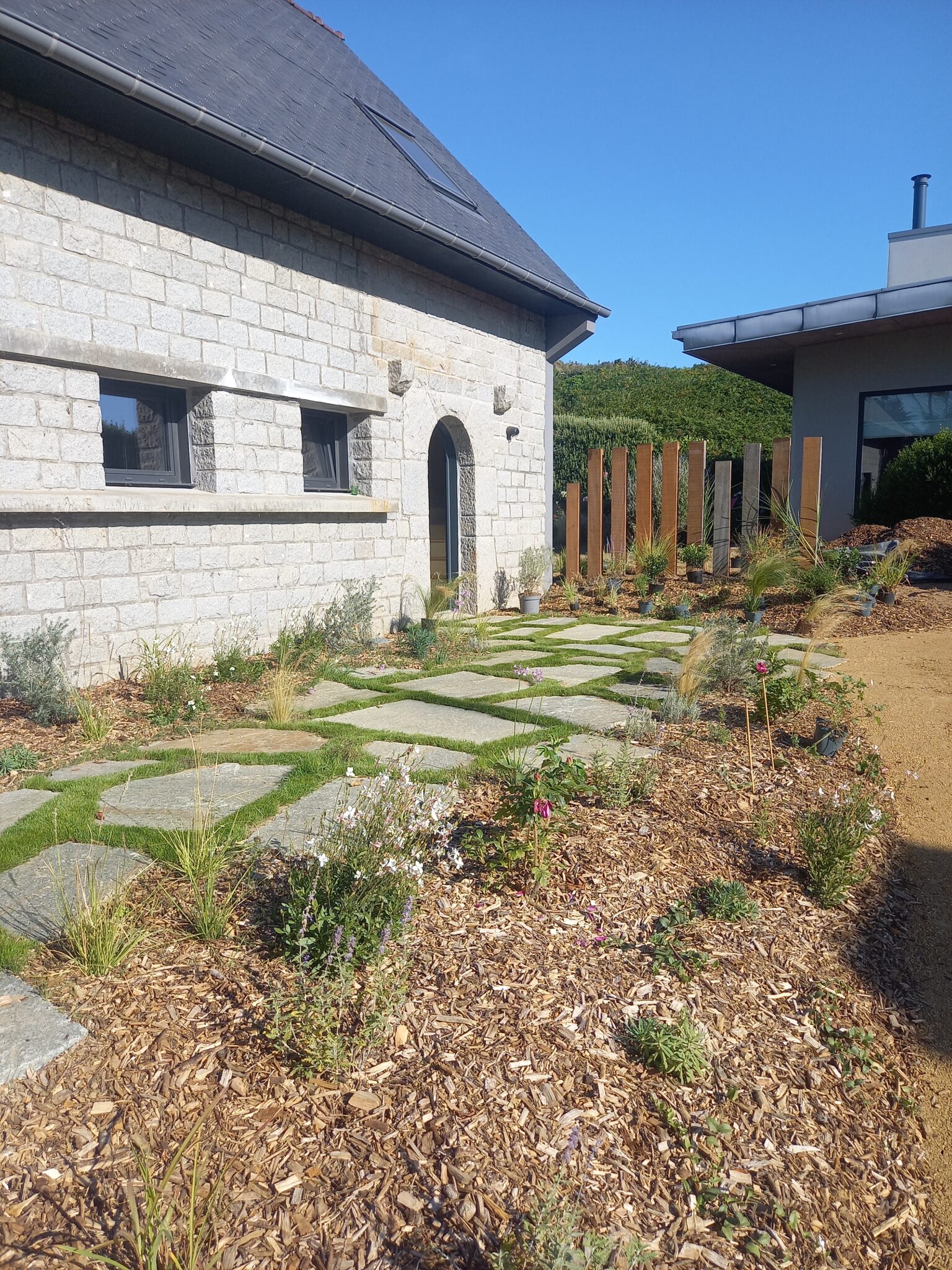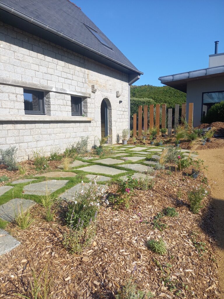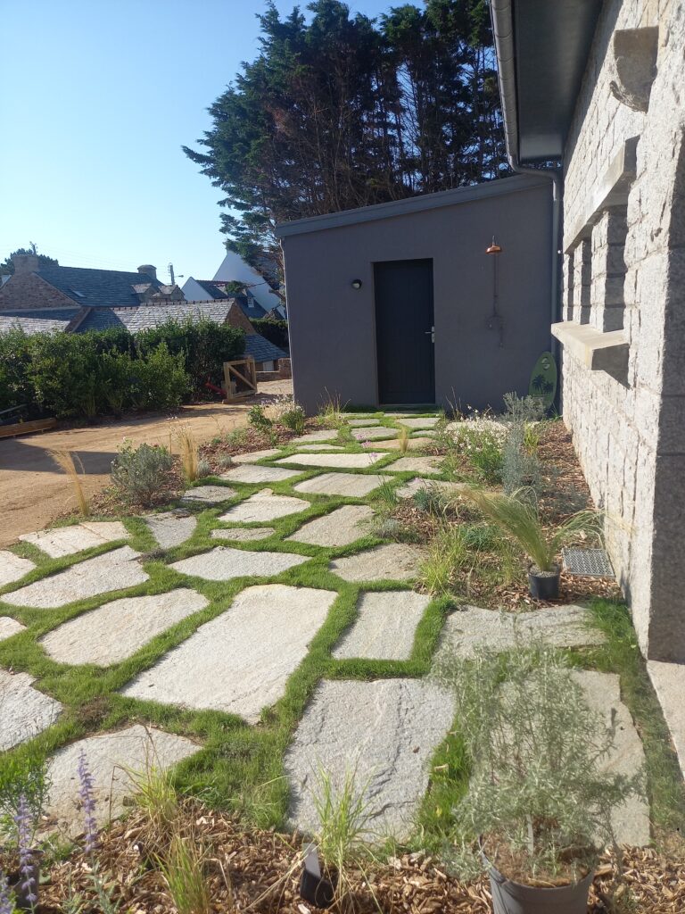 - Création d’une terrasse en dalles de pierre,