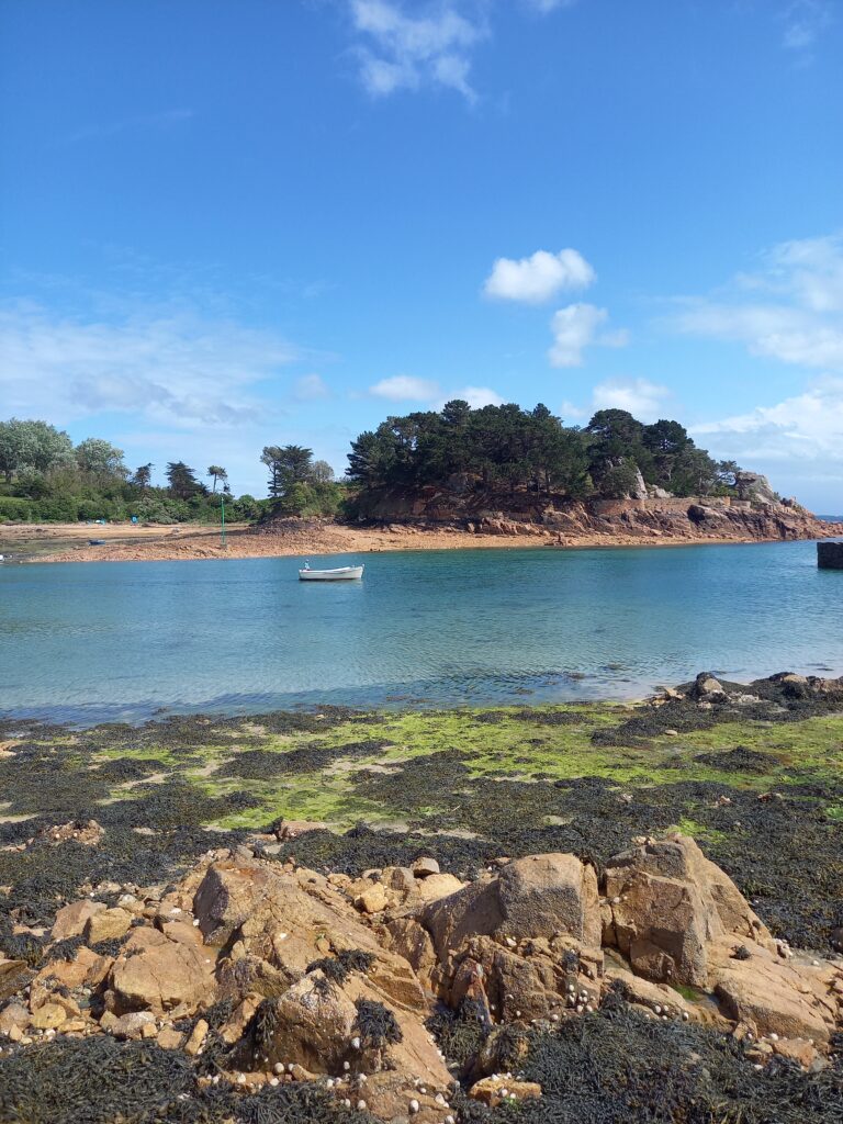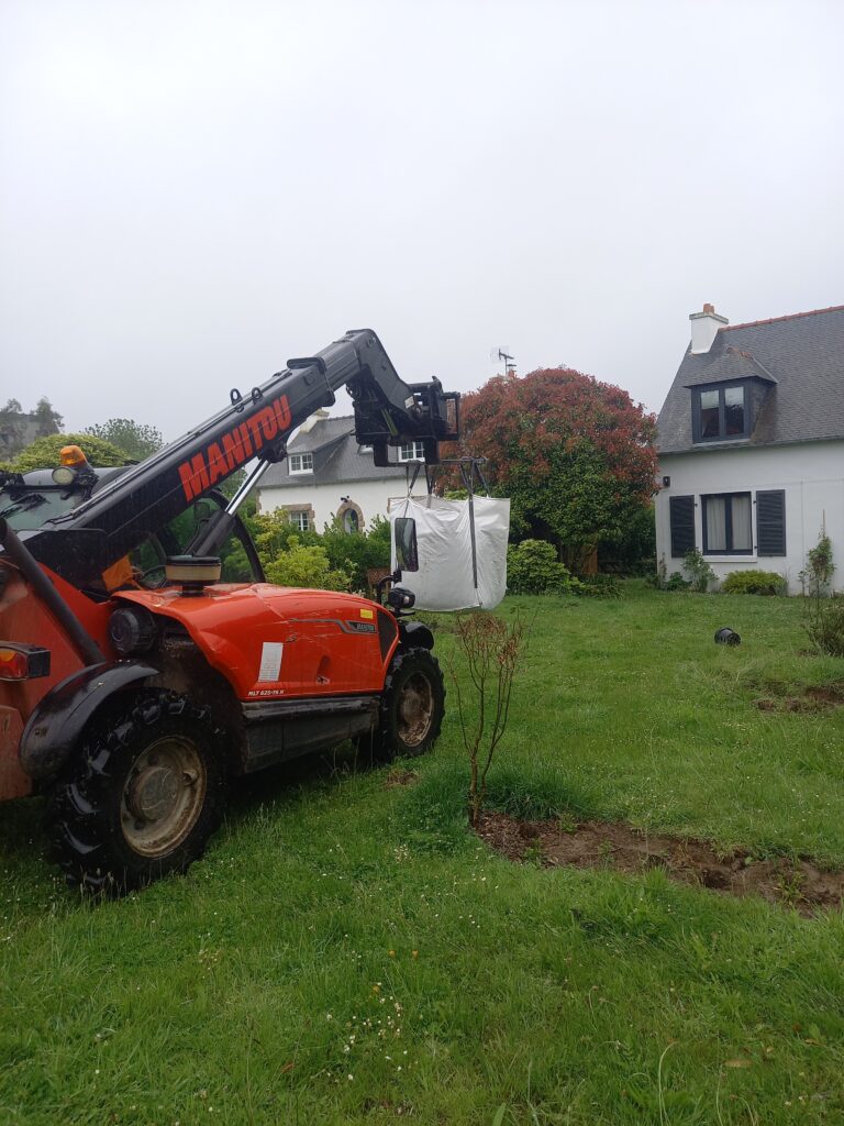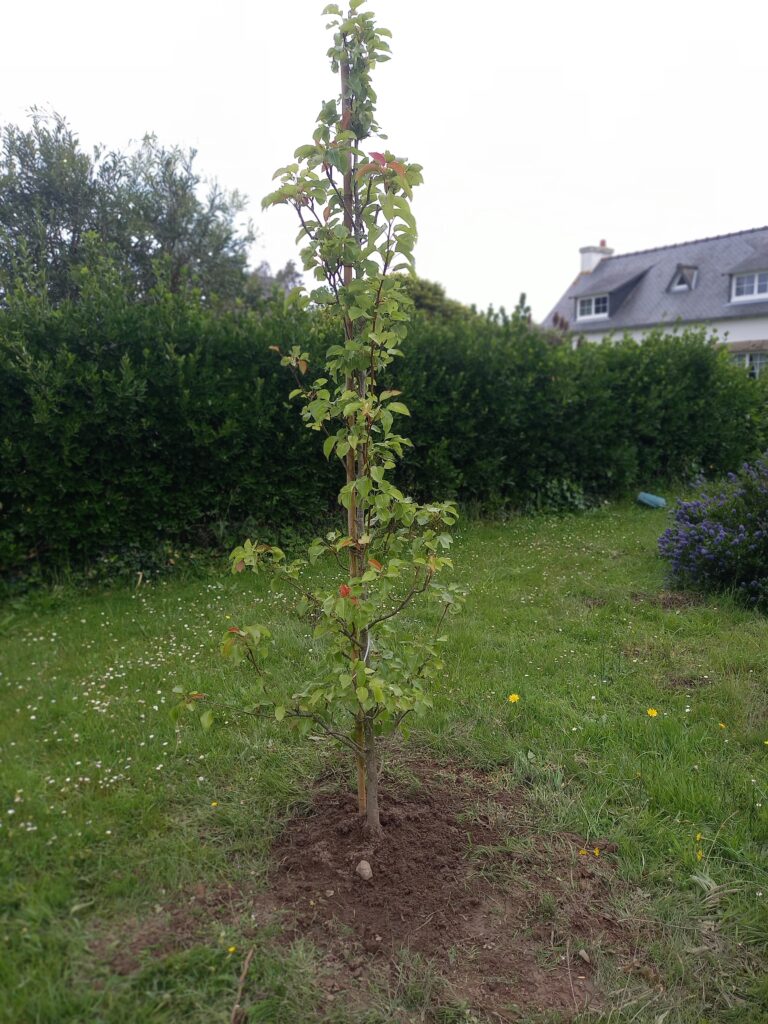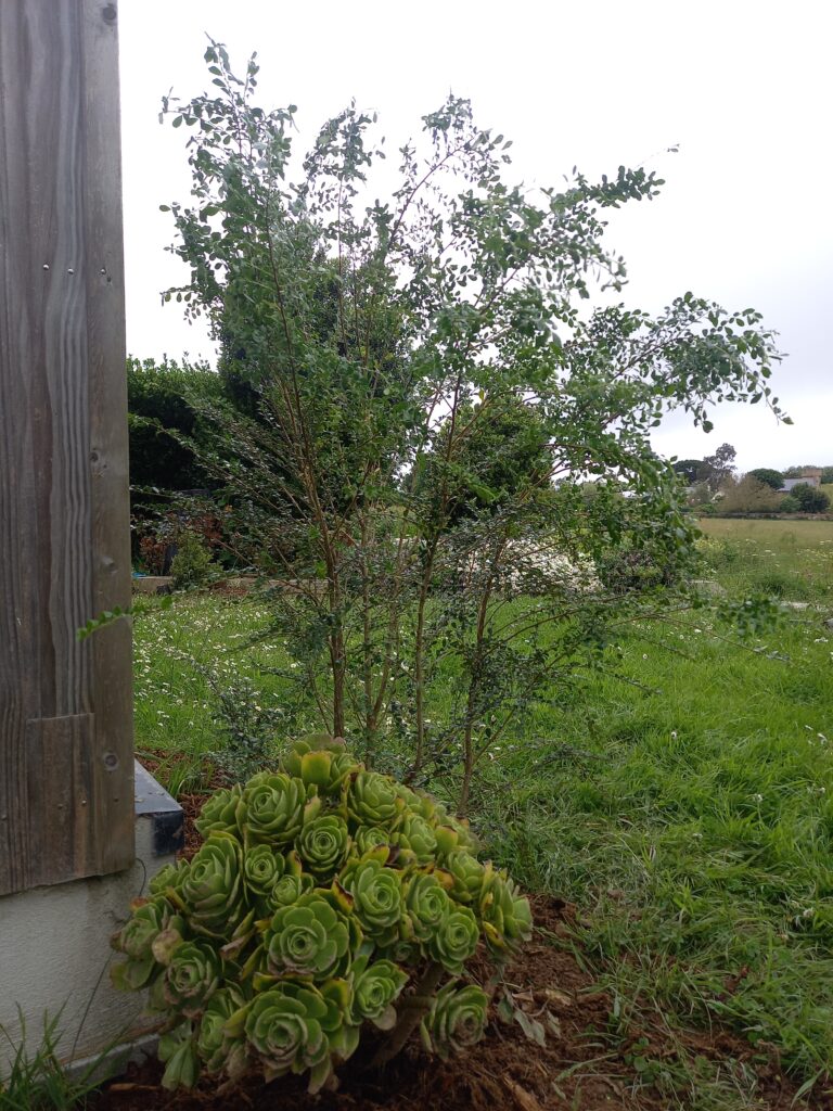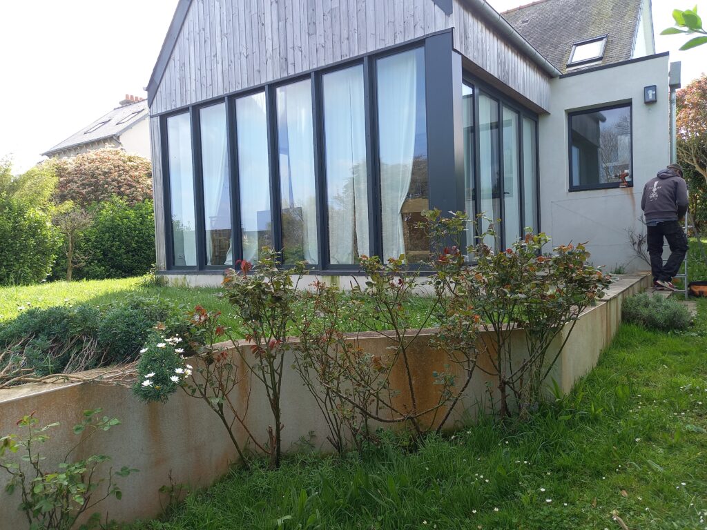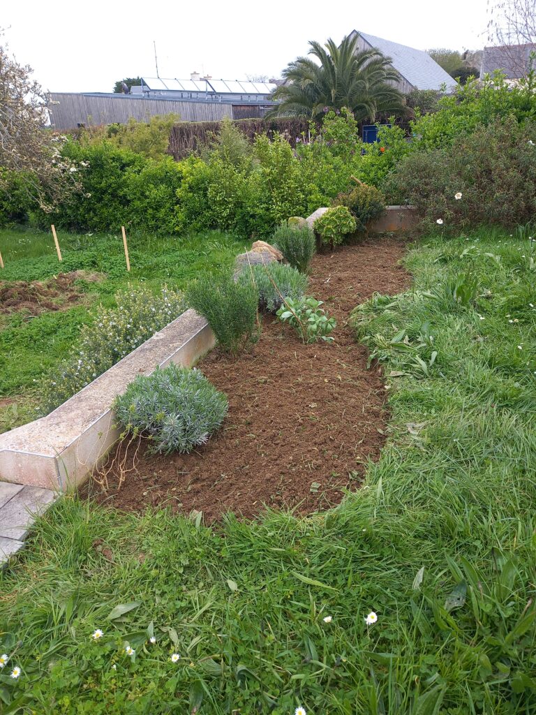 Le cadre est très beau, le jardin est mitoyen avec d’autres très arborés et devant le jardin longe une belle prairie de nature et termine sur un petit boisement. Le faisan est là, caché, nous l’entendons pendant tout le chantier, les merles et les pies sont rois et reines sur l’île quand tout est encore calme avant les vacances…