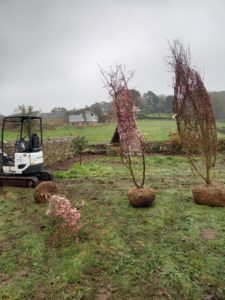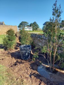 Interventions : Création de tous les massifs avec différentes strates arborées, arbustives et vivaces. Choix des plantes en pépinière et plantations. Plantations de fruitiers palissés et arbustes à petits fruits (cassis, groseilles, myrtilles, poiriers, pommiers). Conception des circulations autour de la maison et terrasses. Conception du jardin Nord, petit boisement frais.