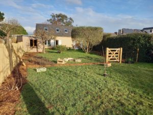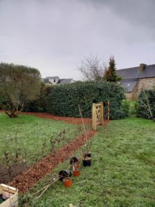 Interventions : Création de haies et clôtures avec portail et portillon permettant la création de deux ilots jardinés. Un plus esthétique, l’autre plus productif. Création des massifs, palettes végétales et plantations. Pose de câble pour les grimpantes. Plantations d’arbustes sur le talus du fond. Plantations de fruitiers et fruits rouges. Suivi du jardin sur plusieurs années.
