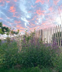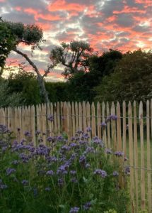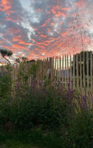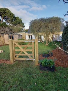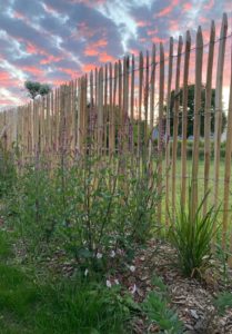 J’imagine alors un petit cocon fleuri tout en simplicité. Des mixed-borders colorées dans les tons roses, des arbres aux belles floraisons et aux impressionnantes fructifications. Je ferme certaines vues physiquement et visuellement avec une charmille basse, une haie d’if haute et une ganivelle de châtaigner, support à de superbes grimpantes.