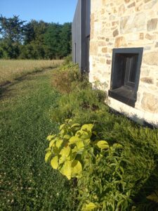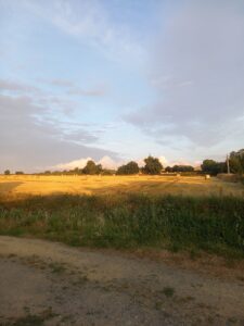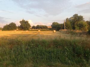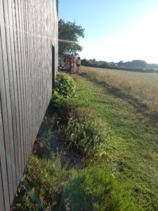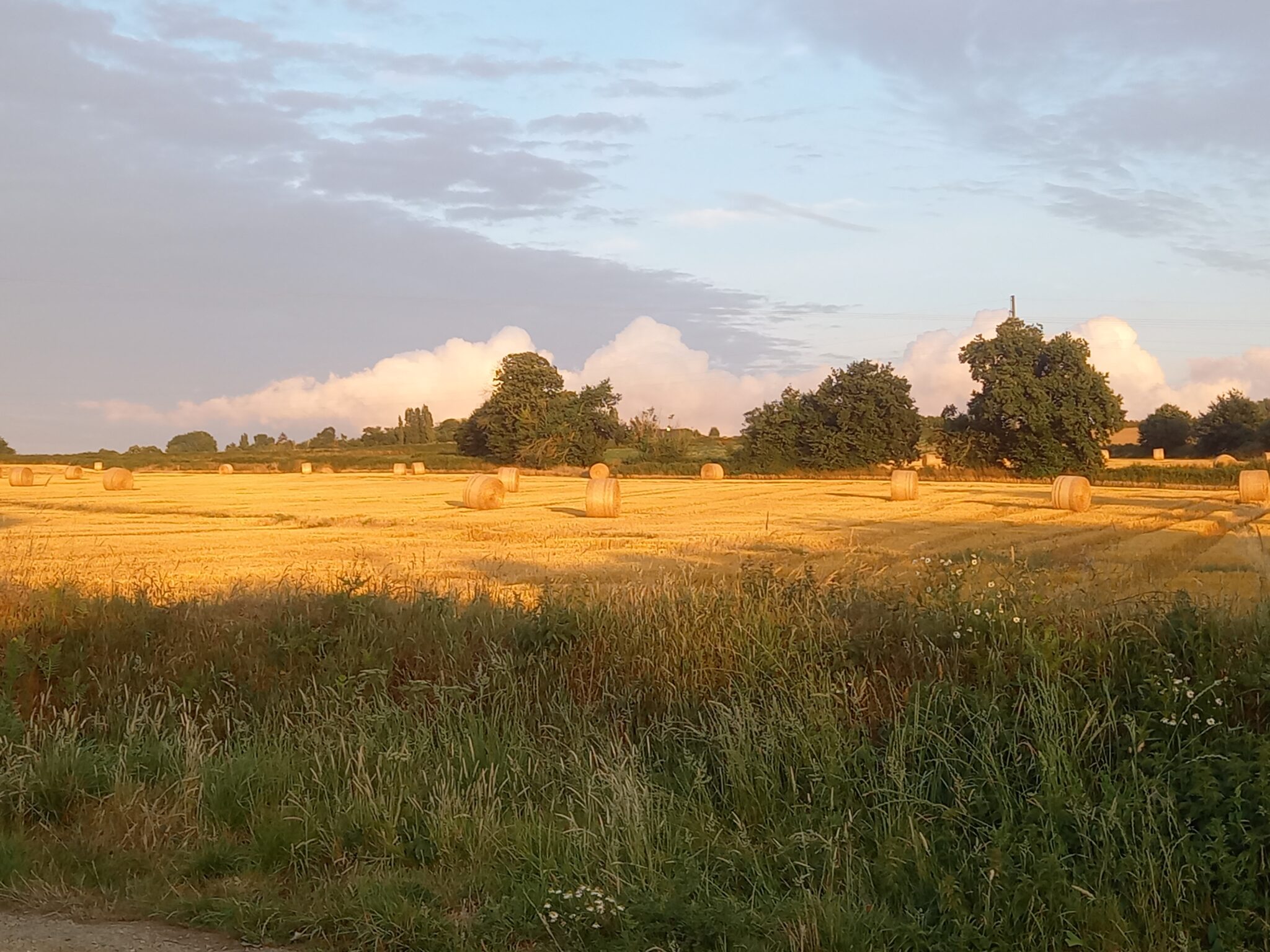 Une grande pelouse, comme un tapis déroulé aux amis pour les grandes réceptions champêtres à l’avant, et, à l’arrière, une petite pelouse pour le soleil couchant sur les champs dorés.